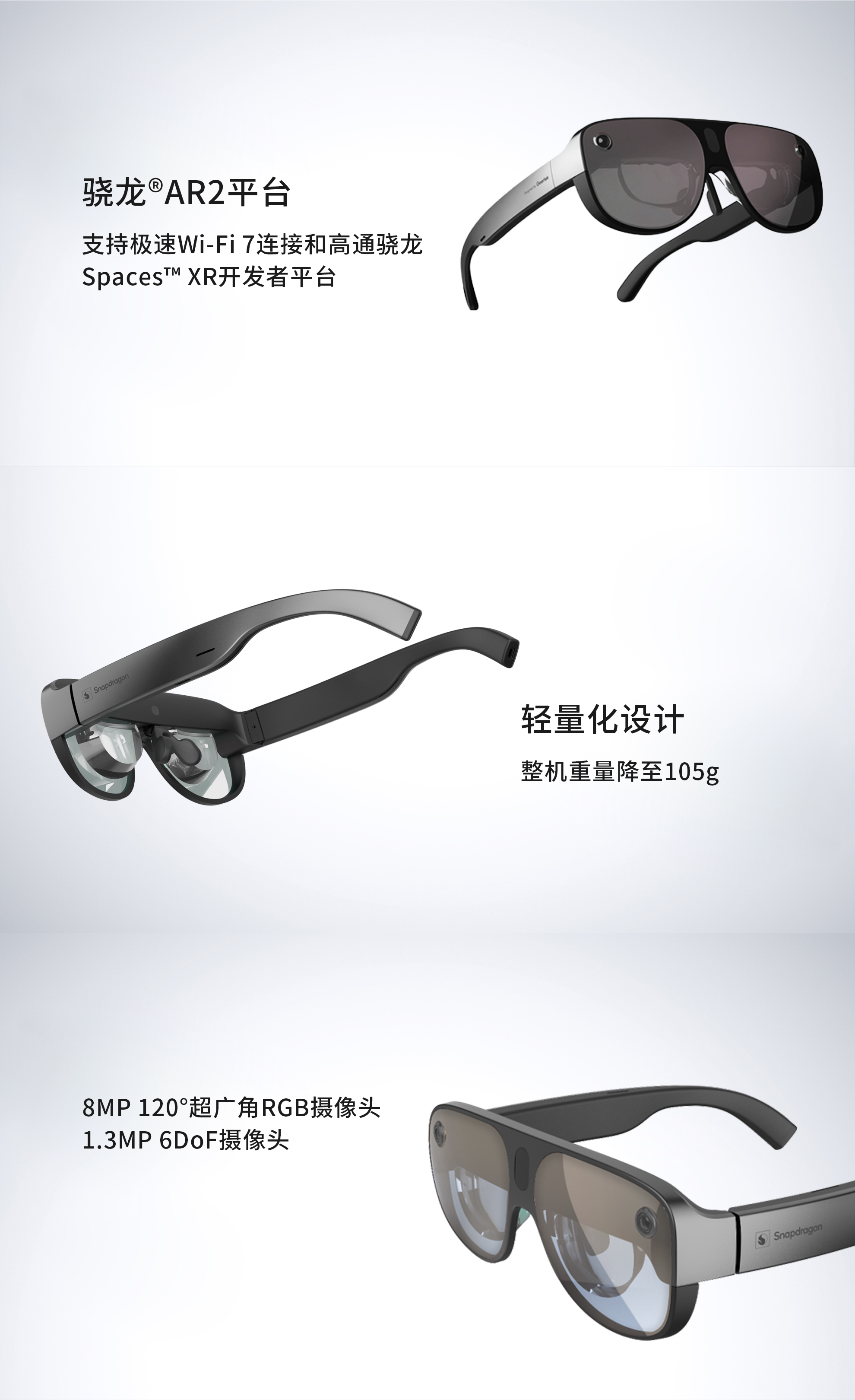 基于骁龙®AR2平台的轻量级AR智能眼镜参考设计,是尊龙凯时与高通自2015年合作以来开发的第三代AR眼镜参考设计,支持骁龙Spaces™ XR开发者平台,致力于满足企业和消费者不同产品需求,帮助终端品牌厂商快速开发量产性能卓越的轻量级AR智能眼镜产品。