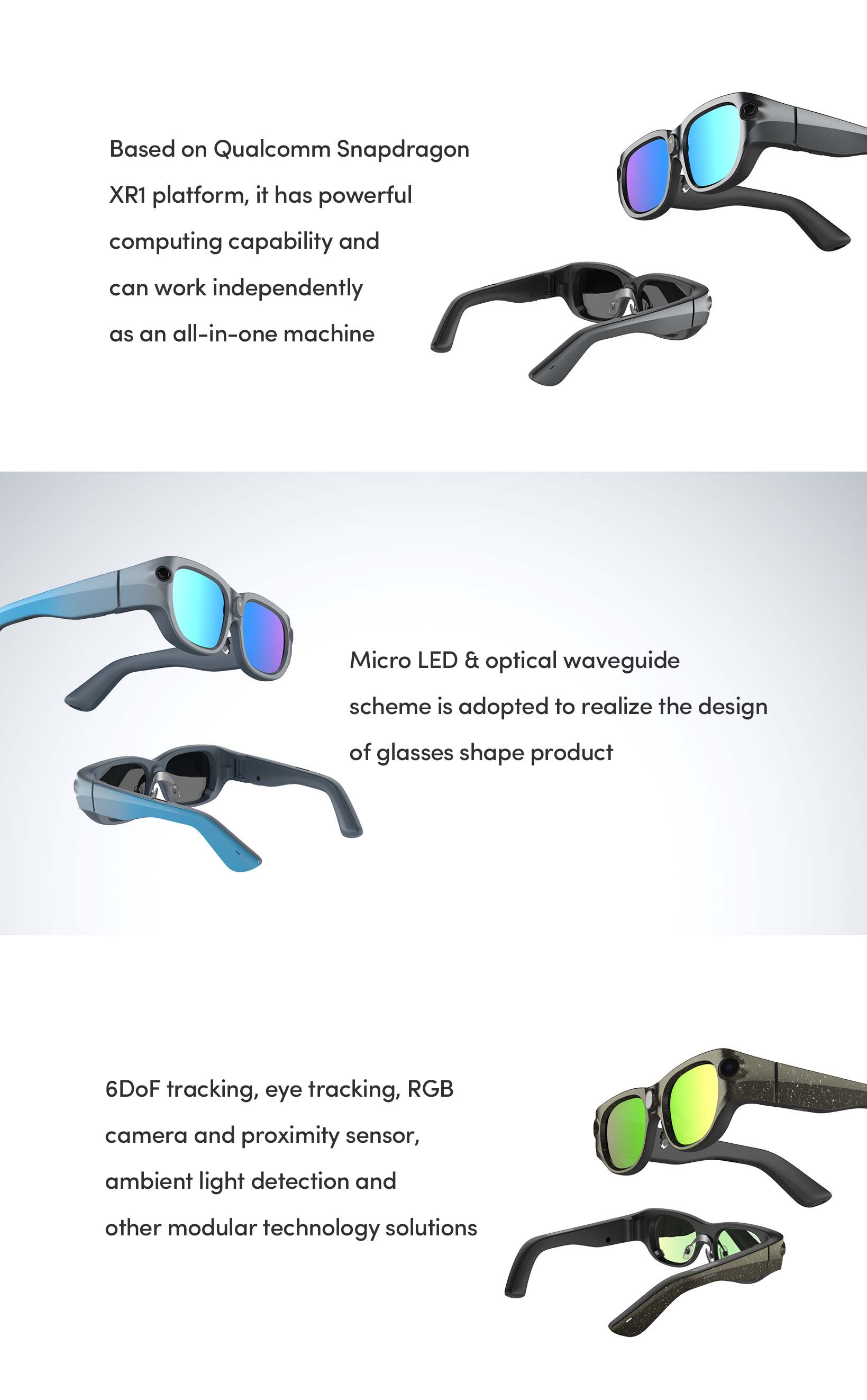 The AR All-in-one reference design based on Qualcomm Snapdragon XR1 platform, using Micro LED+ diffractive optical waveguide optical module to provide high performance AR experience for consumers and enterprises.