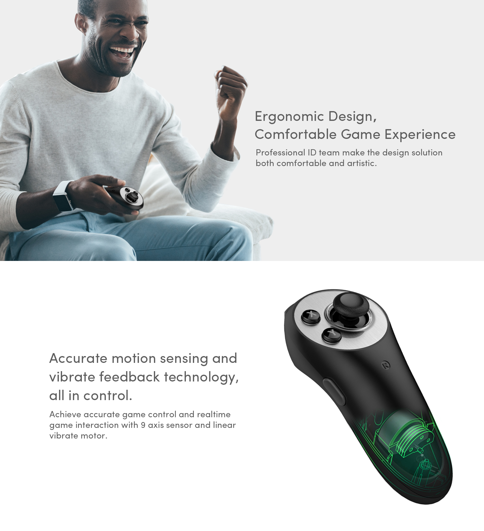 ▪ Ergonomic design, comfortable game experience. ▪ Sensor: action sensor, gravity sensor, acceleration transducer. ▪ Motor: provide feedback to users.