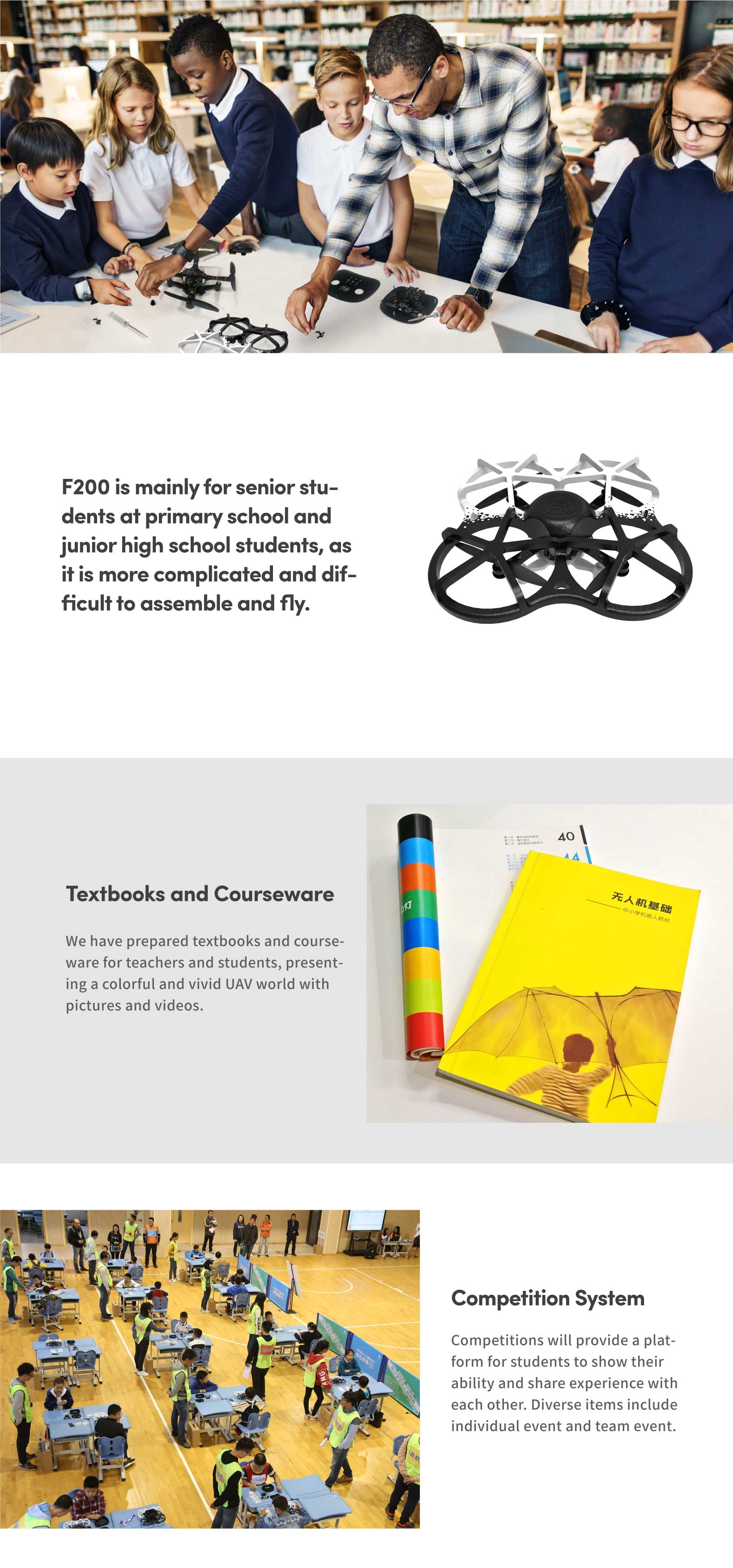 F200 educational drone is a brand new product developed by Goertek. It is closely integrated with STEAM education philosophy, and it contains AI courses. It fully trains children's abilities through hands-on assembly and flight operation, and popularize scientific knowledge and laws and regulations.
